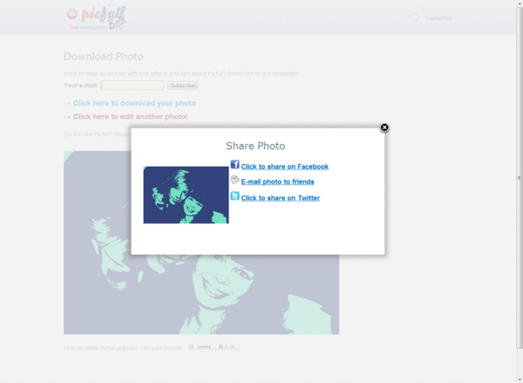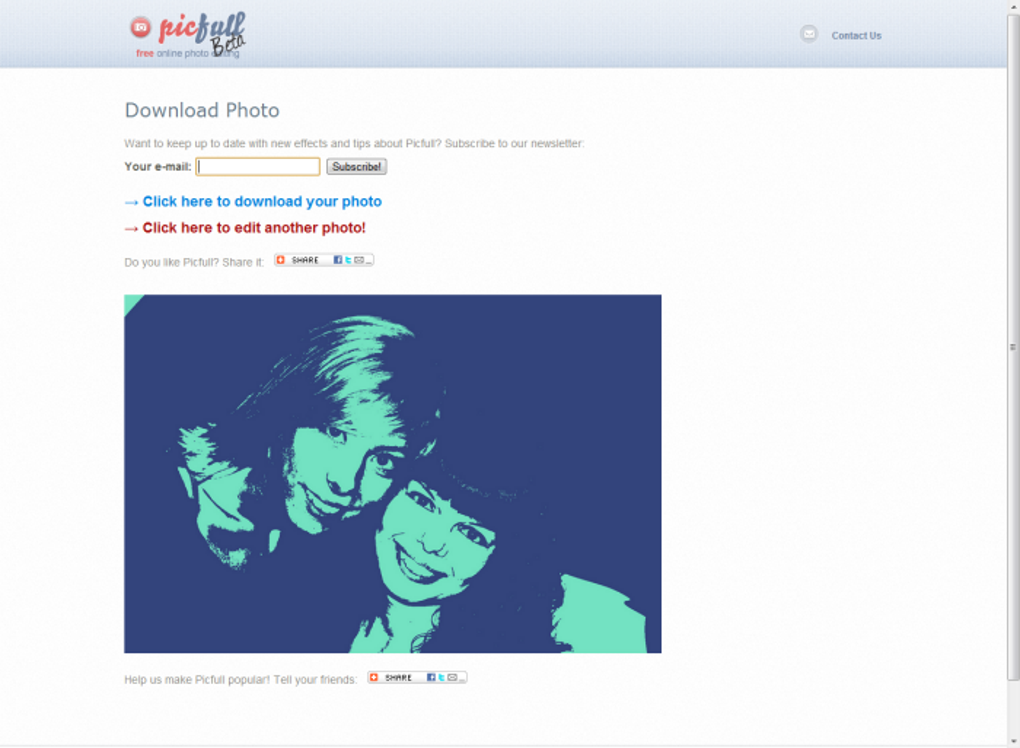 Cuando tengas lista tu pequeña maravilla, Picfull te dará la opción de guardarla en tu ordenador y de compartirla a través de distintos sitios. ¿La quieres de perfil de Facebook? ¿Y para enviarla por correo? Pues todo eso es posible.